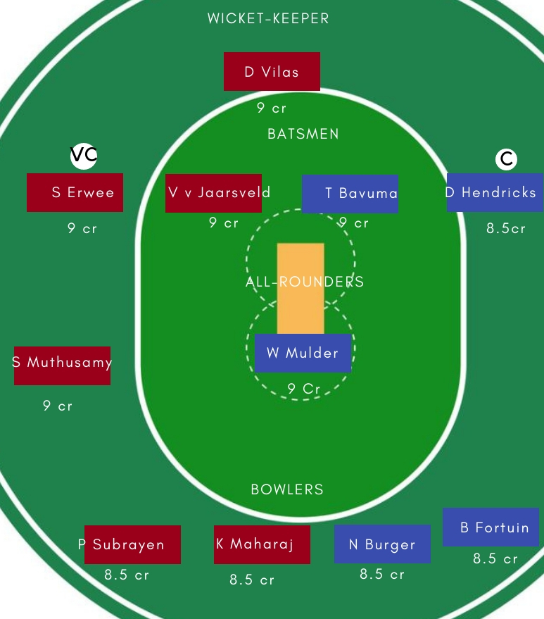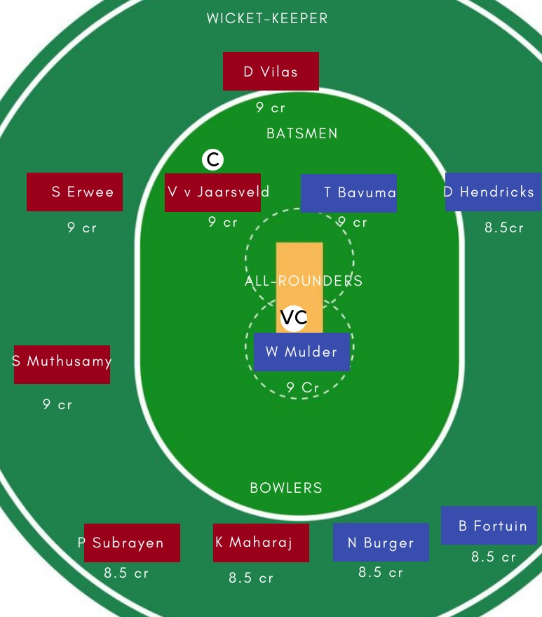 गेंदबाज – गेंदबाजी में Bjorn Fortuin, Keshav Maharaj, Prenelan Subrayen सबसे अच्छे विकल्प होगें। Fortuin ने पिछले मैच में दो विकेट अपने नाम किए थें। जबकि Subrayen ने इस सीजन अच्छी गेदबाजी की है।