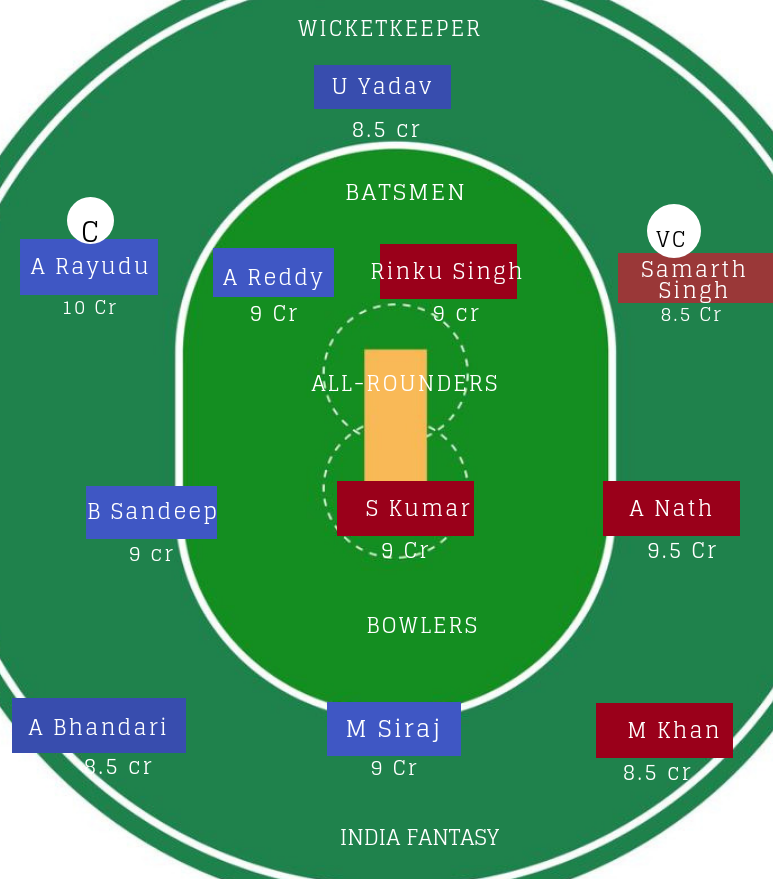 बल्लेबाज : A Rayudu पहले मैच में नहीं चले. लेकिन, रायडू को टीम में अवश्य लें. आप उन्हें कप्तान भी बना सकते हैं. Akshath Reddy हैदराबाद के शानदार बल्लेबाज हैं. पहले मुकाबले में अक्षत ने नाबाद 69 रन बनाए थे.