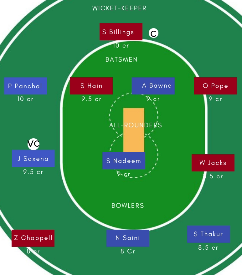 ऑलराउंडर – ऑलराउंडर के तौर पर Jalaj Saxena, Shahbaz Nadeem, Lewis Gregory सबसे अच्छे विकल्प होगें। Jalaj Saxena बल्ले और गेद दोनों से अहम योगदान दे सकते है।