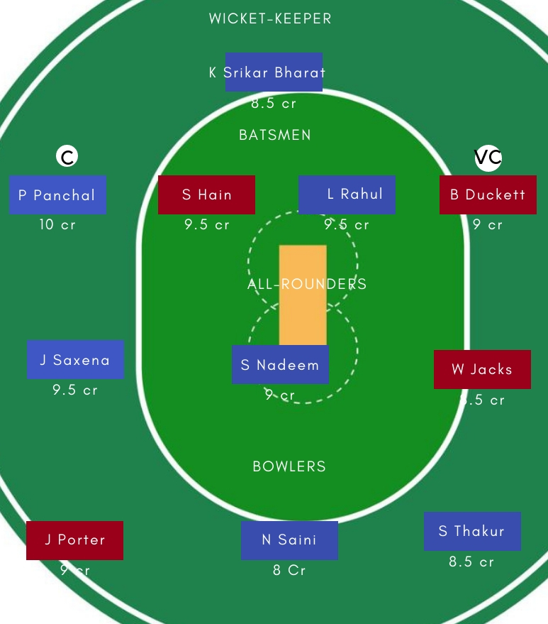 बल्लेबाज – बल्लेबाजी में Priyank Panchal, Kl Rahul, Ben Duckett, Sam Hain सबसे अच्छे विकल्प होगें। Priyank ने पहले टेस्ट मैच में शानदार दोहरा शतक जड़ा था। वही, Sam Hain ने दोनोें ही पारी मेंं अर्धशतकीय पारी खेली थी।