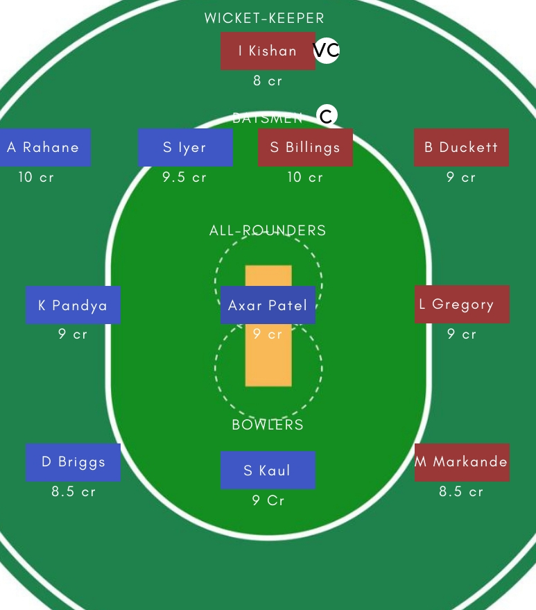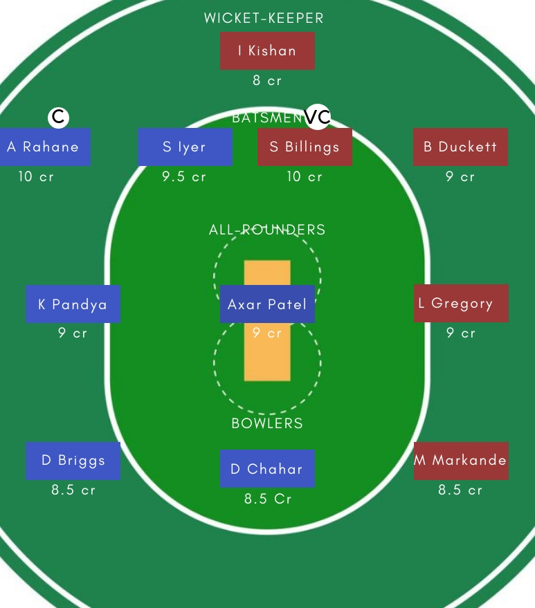 बल्लेबाज – बल्लेबाजी में Ajinkya Rahane, Sam Billings, Shreyas Iyer, Ben Duckett इस मैच के लिए सबसे अच्छे ऑप्शन होगें। Ajinkya Rahane ने पिछले मैच में शानदार अर्धशतकीय पारी खेली थी। वही, Sam Billings ने शानदार शतकीय पारी खेली थी।