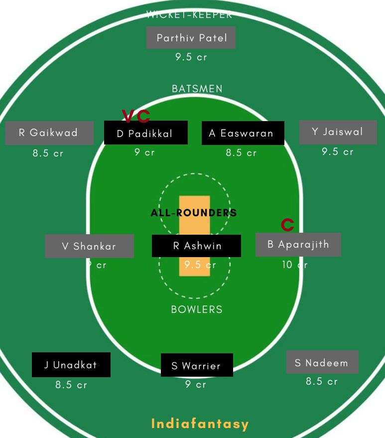 Parthiv Patel, Yashasvi Jaiswal, Nitish Rana, Priyank Panchal, R Gaikwad, K Jadhav, Baba Aparajith, V Shankar, K Gowtham, R Kalaria, Shahbaz Nadeem.
