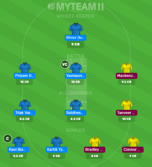 Wicket Keeper: Dhruv Jurel Batsmen: Priyam Garg Jashasvi Jaiswal Mackenzie Harvey All-Rounders: Tilak Verma Siddhesh Veer Tanveer Sangha Bowlers: Ravi Bishnoi Kartik Tyagi Connor Sully Bradley Simpson