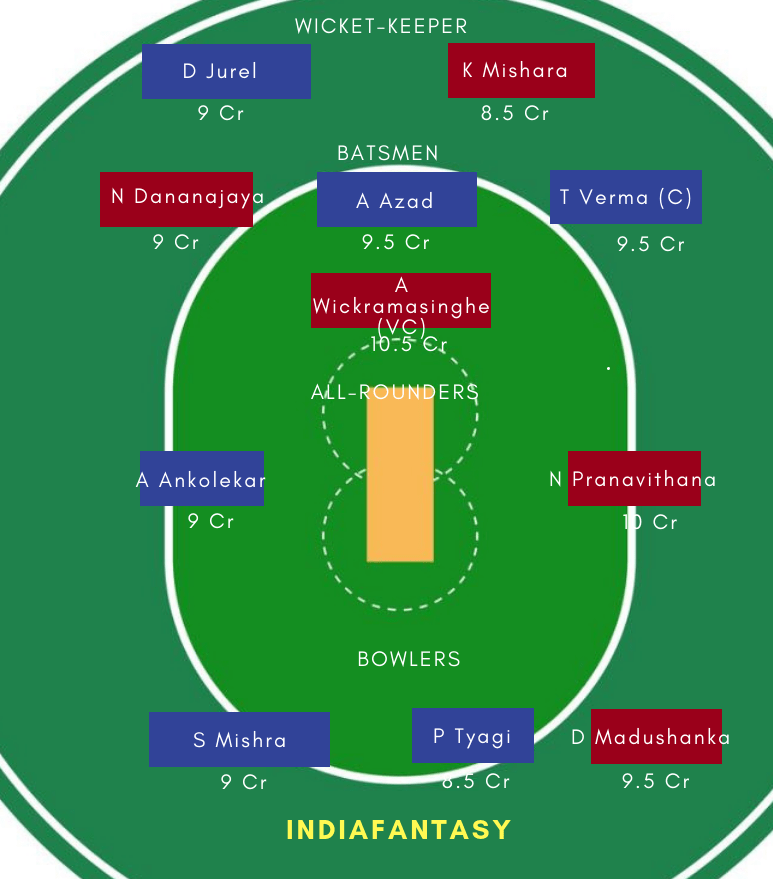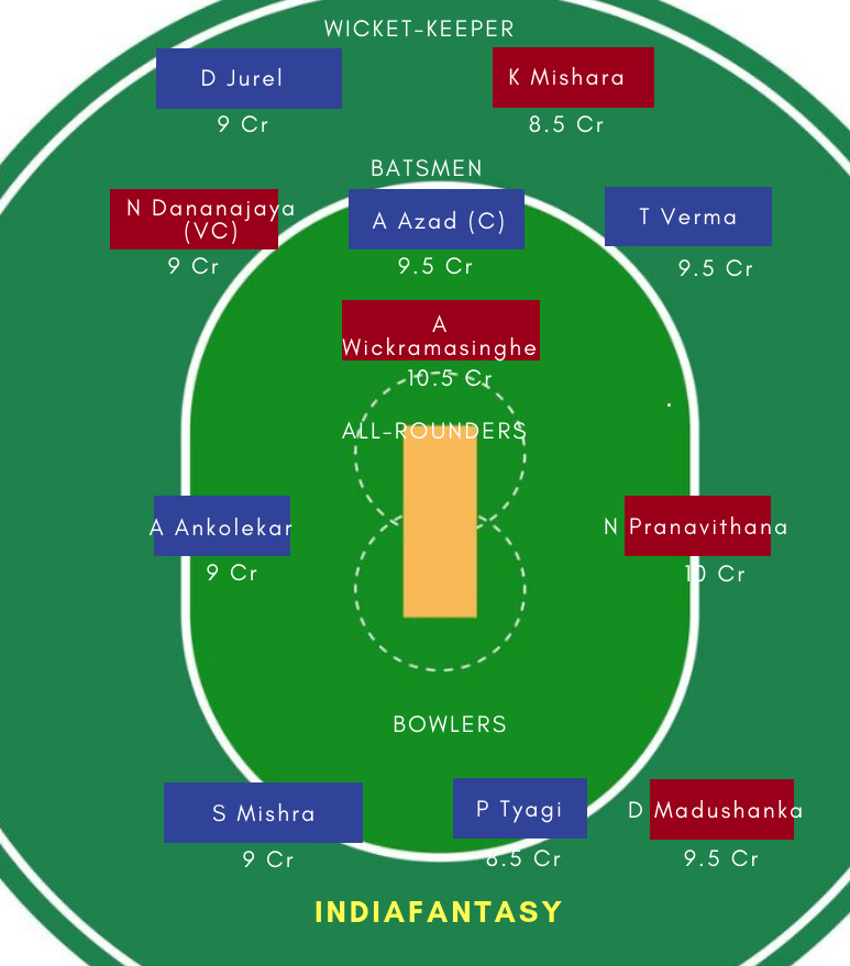 Tilak Varma, Arjun Azad, Shashwat Rawat, Dhruv Jurel (c), Akash Singh, Varun Lavande/Nehal Wadhera, Atharva Ankolekar, Sushant Mishra, Purnank Tyagi, Karan Lal, Salil Arora (wk)