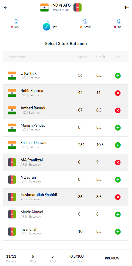 Now, you need to use your skills in picking the best set of players in the allotted budget. Also, the maximum players you can choose from a team is 6, i.e., 6 from one side and 5 from the opposition.