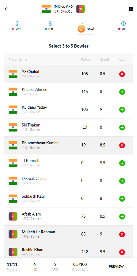 In bowling, Mujeeb Ur Rahman and Rashid Khan from Afghanistan are a sure shot starters. From India, Bhuvaneshwar Kumar and Yuzvendra Chahal can be the right choices.