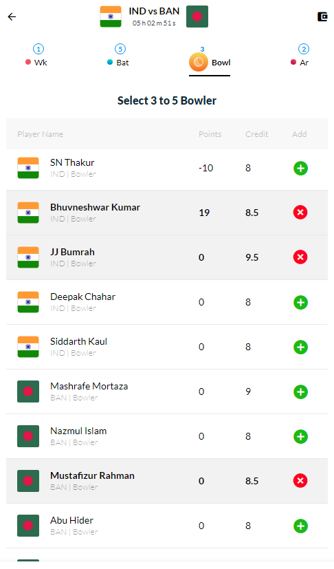 In bowlers, Bhuvaneshwar Kumar, Jasprit Bumrah and Mustafizur Rahman will be good choices.