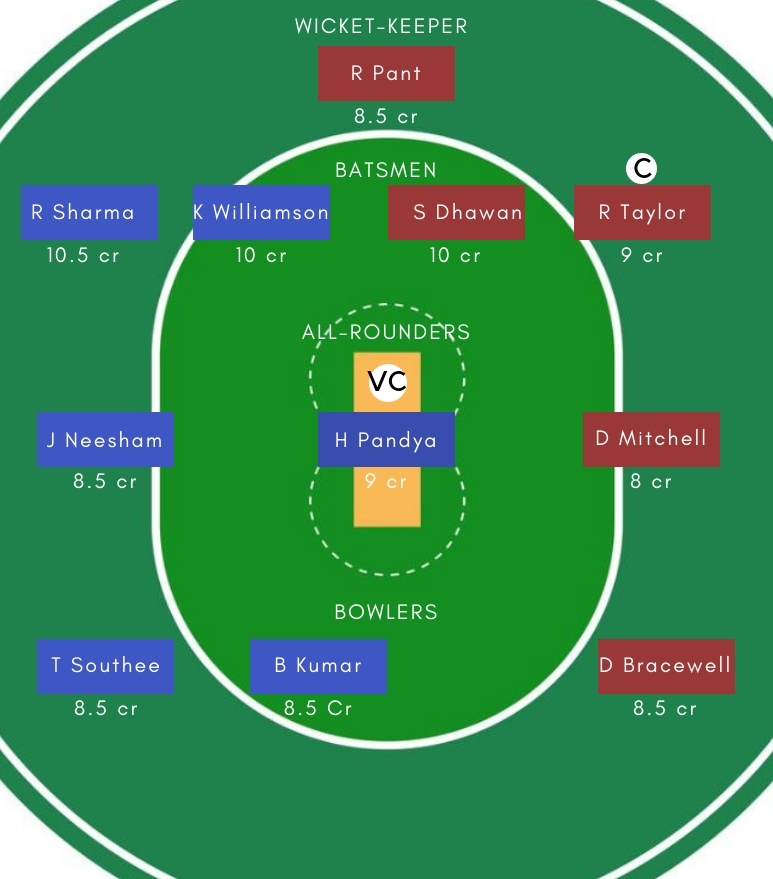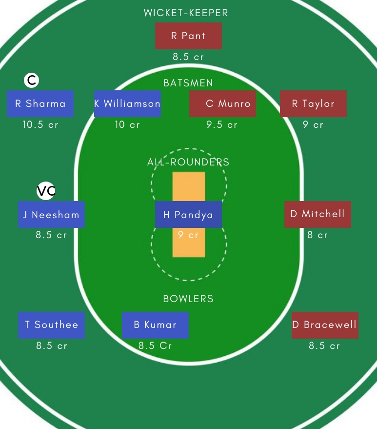 गेंदबाज – गेंदबाजी में Bhuvneshwar Kumar, Tim Southee, Lockie Ferguson, ish Sodhi सबसे अच्छे विकल्प होगें। Bhuvneshwar Kumar ने वनडे सीरीज में अच्छी गेंदबाजी का प्रदर्शन किया था।