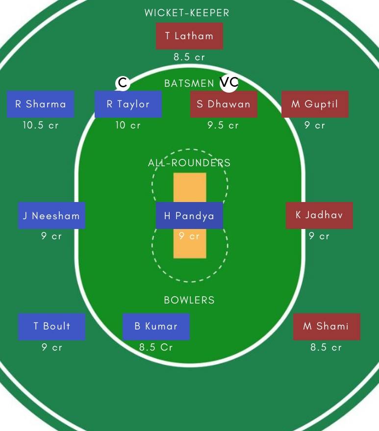 बल्लेबाज – बल्लेबाजी में Rohit Sharma, Shikhar Dhawan, Ross Taylor, Kane Williamson सबसे अच्छे विकल्प होगें। Rohit ने पिछले दोनों ही मुकाबलें में शानदार अर्धशतकीय पारी खेली है। वही, Dhawan इस पूरी सीरीज में बेहद शानदार फॉर्म में नजर आए है।