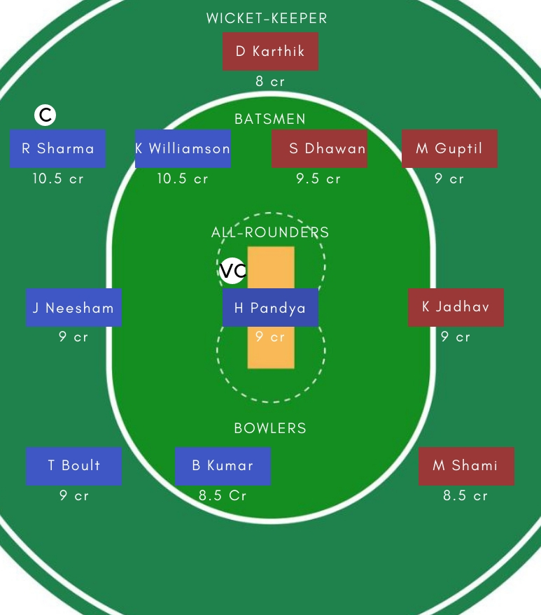 गेंदबाज – गेंदबाजी में Bhuvneshwar Kumar, Mohammad Shami, Kuldeep Yadav, Trent Boult सबसे अच्छे विकल्प होेगें। Shami ने इस सीरीज में बेहद शानदार गेंदबाजी की है। पिछले मैच में भी उन्होने तीन विकेट चटकाए थें।