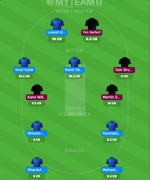 Wicket Keeper: Lokesh Rahul Tim Seifert Batsmen: Martin Guptill Kane Williamson Virat Kohli Rohit Sharma Tom Bruce All-Rounders: Ravindra Jadeja Shivam Dube Bowlers: Mohd Shami Shardul Thakur