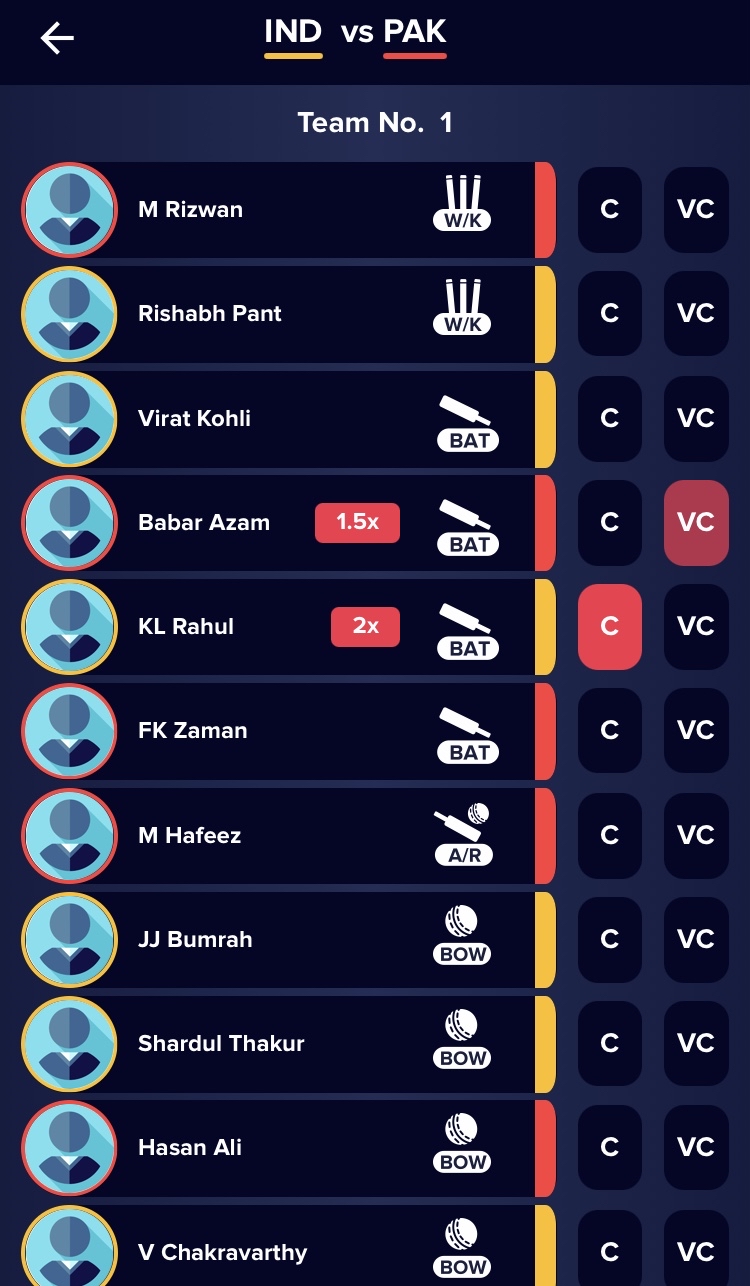 WICKET-KEEPERS: Rishabh Pant, Mohammad Rizwan BATTERS: Babar Azam, Virat Kohli, KL Rahul, Fakhar Zaman ALL-ROUNDERS: Mohammad Hafeez BOWLERS: Jasprit Bumrah, Varun Chakravarthy, Hasan Ali, Shardul Thakur