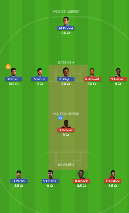 बल्लेबाज – बल्लेबाजी में Virat Kohli, Rohit Sharma, shikhar Dhawan, Shimron Hetymer सबसे अच्छे विकल्प होगे। Virat और Rohit ने पिछलें मैच में शानदार शतकीय पारी खेली थी। तो वही Hetymer ने भी ताबड़तोड बल्लेबाजी कर के दिखाई थी।