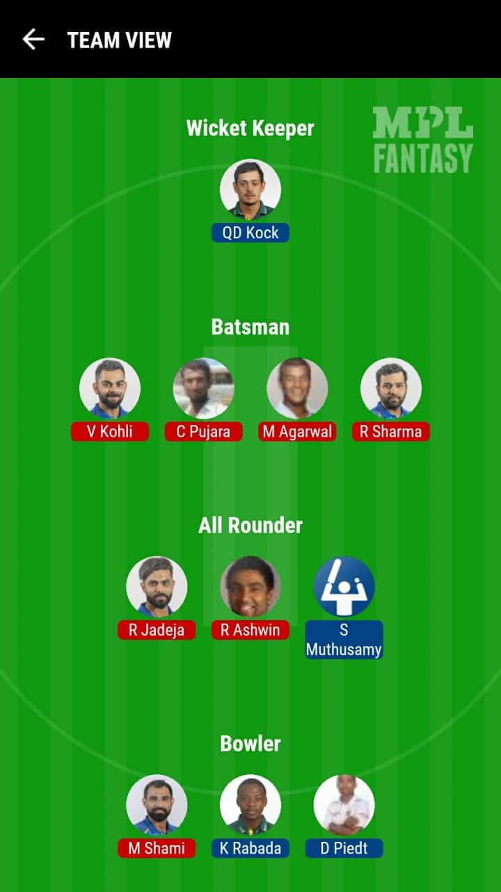 Rohit Sharma, Mayank Agarwal, Cheteshwar Pujara, Virat Kohli, Ajinkya Rahane, Umesh Yadav, Wriddhiman Saha, Ravichandran Ashwin, Ravindra Jadeja, Mohammed Shami, Ishant Sharma/Kuldeep Yadav