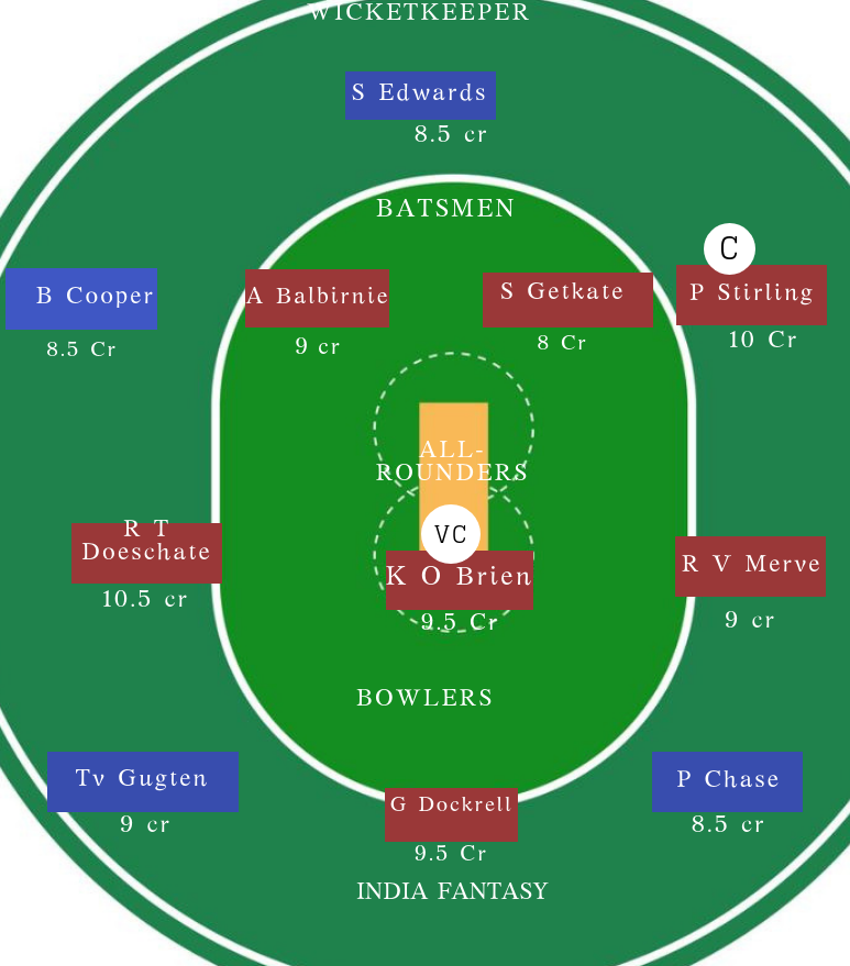 बल्लेबाज : Paul Stirling (c), Andrew Balbirnie, Lorcan Tucker, Shane Getkate