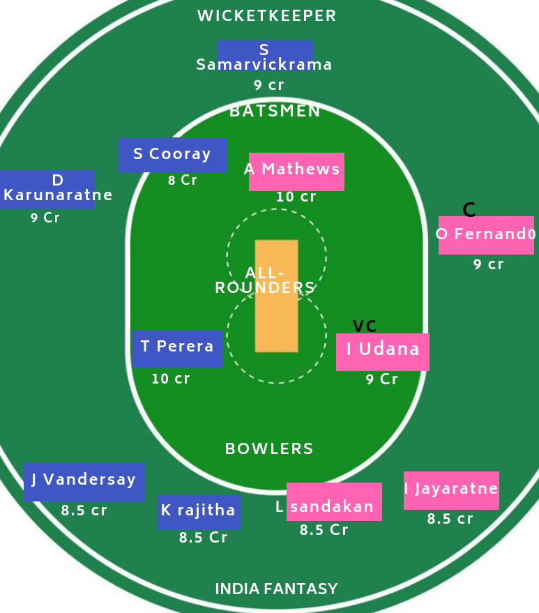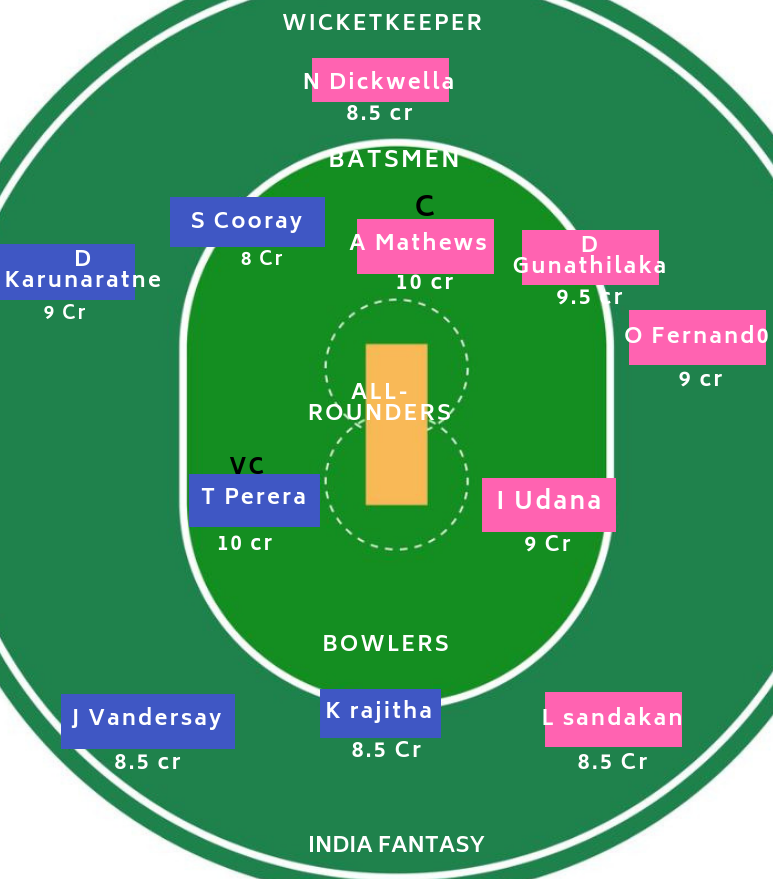 Thisara Perera, Sachithra Senanayake, Dimuth Karunaratne (c), Dilesh Gunaratne, Malinda Pushpakumara, Chaturanga de Silva, Sadeera Samarawickrama (wk), Jeffrey Vandersay, Kasun Rajitha, Pathum Nissanka, Sangeeth Cooray