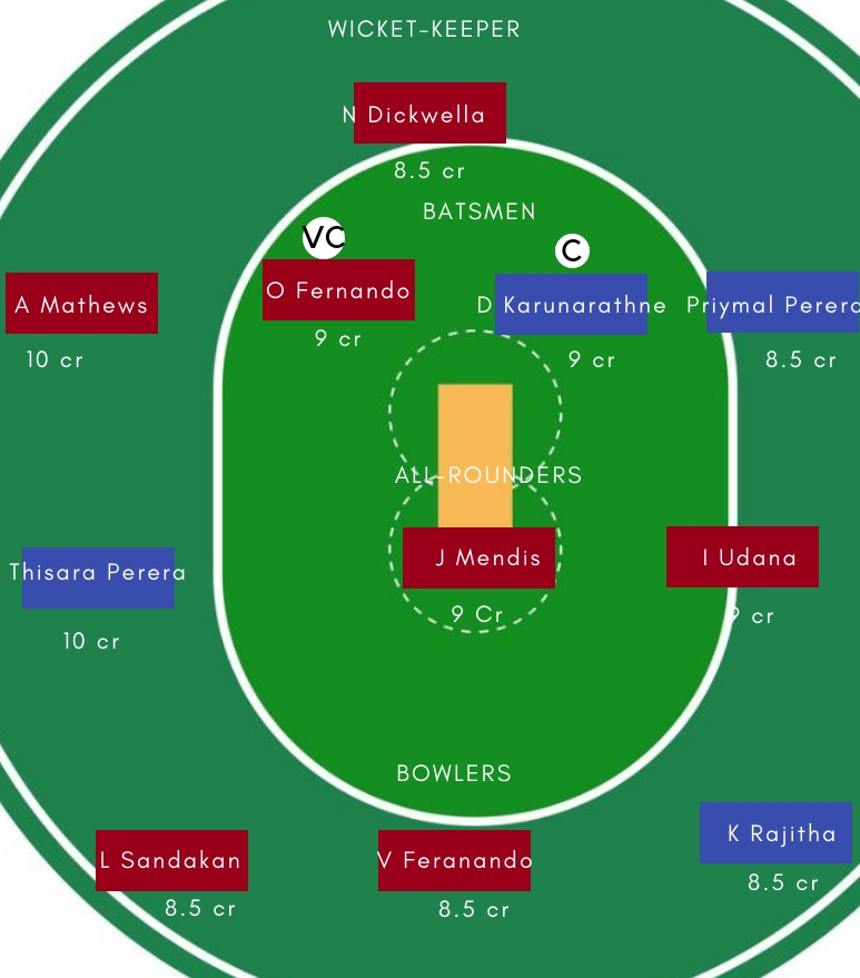 बल्लेबाज – बल्लेबाजी में Dimuth Karunarathne, Oshada Fernando, Sangeeth Cooray, Angelo Mathews सबसे अच्छे विकल्प होंगे। Karunarathne इस टूर्नामेंट में अबतक अच्छी फॉर्म में नजर आए है। जबकि Cooray ने पिछले मैच में शानदार 82 रनों की पारी खेली थी।