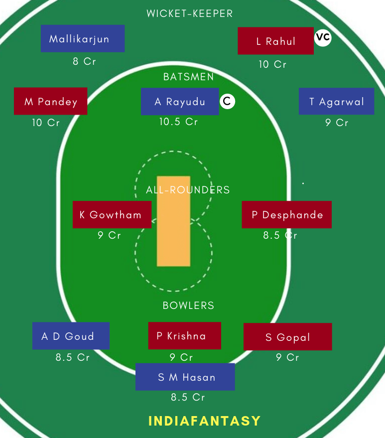 Manish Pandey (Captain), KL Rahul (Vice-Captain), Jagadeesha Suchith, Abhimanyu Mithun, Devdutt Padikkal, KV Siddharth, Pravin Dubey, Pavan Deshpande, Abhishek Reddy, Krishnappa Gowtham, Shreyas Gopal, V Koushik, Prasidh Krishna, Ronit More, Sharath Srinivas (Wicket-keeper)