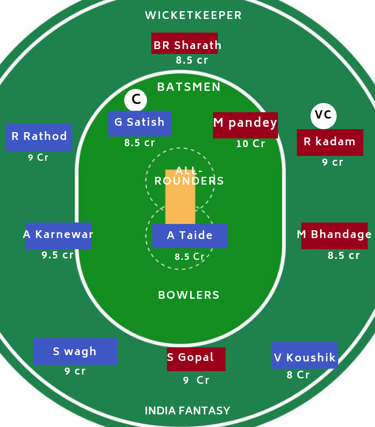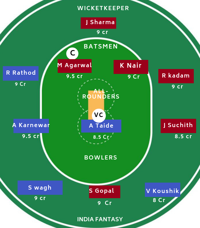 बल्लेबाज : R Rathod ने 5 पारियों में 155 रन बनाए हैं. R kadam के बल्ले से सबसे ज्यादा 437 रन निकले हैं. Manish pandey सात पारियों में 282 रन बना चुके हैं. तो, Karun Nair के बल्ले से भी 213 रन निकले हैं. mayank Agarwal को जरूर टीम में शामिल करें. पिछले मैच में मयंक ने शानदार बल्लेबाजी की थी.