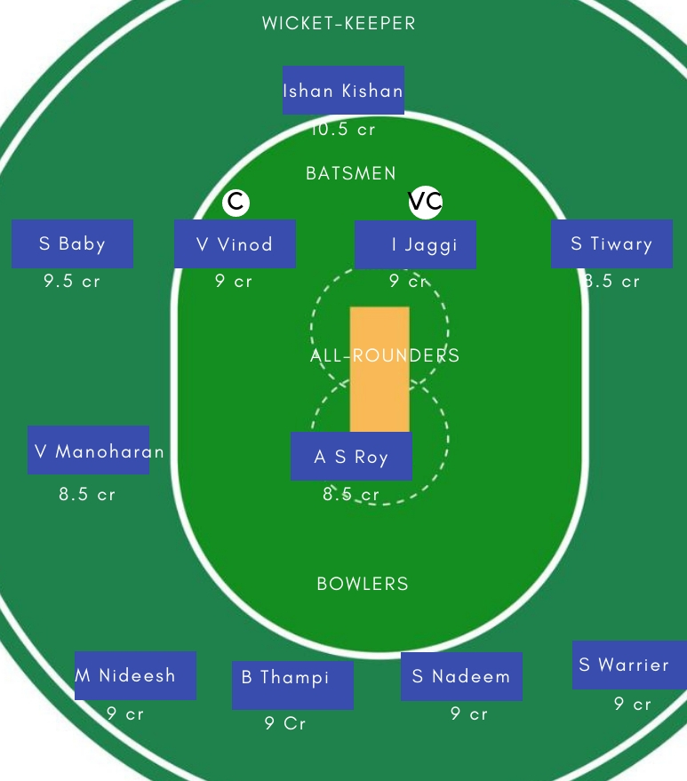 गेंदबाज – गेंदाबजी में S Warrier, Basil Thampi, M Nideesh, S Nadeem सबसे अच्छे विकल्प होगें। Nadeem ने पिछले मैच में तीन विकेट अपने नाम किए थें।जबकि Nideesh ने भी शानदार गेदबाजी करते हुए तीन विकेट अपने नाम किए थें।