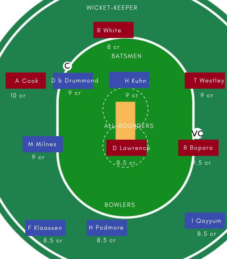 बल्लेबाज: Z Crawley, Daniel Bell-Drummond, Heino Kuhn, M Renshaw, O Robinson, A Blake