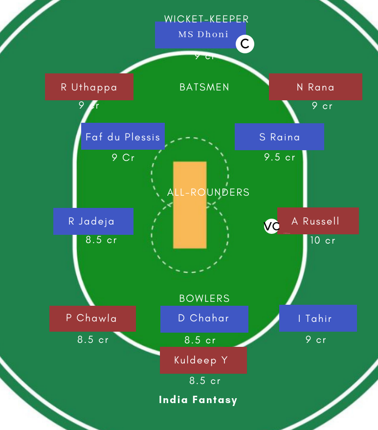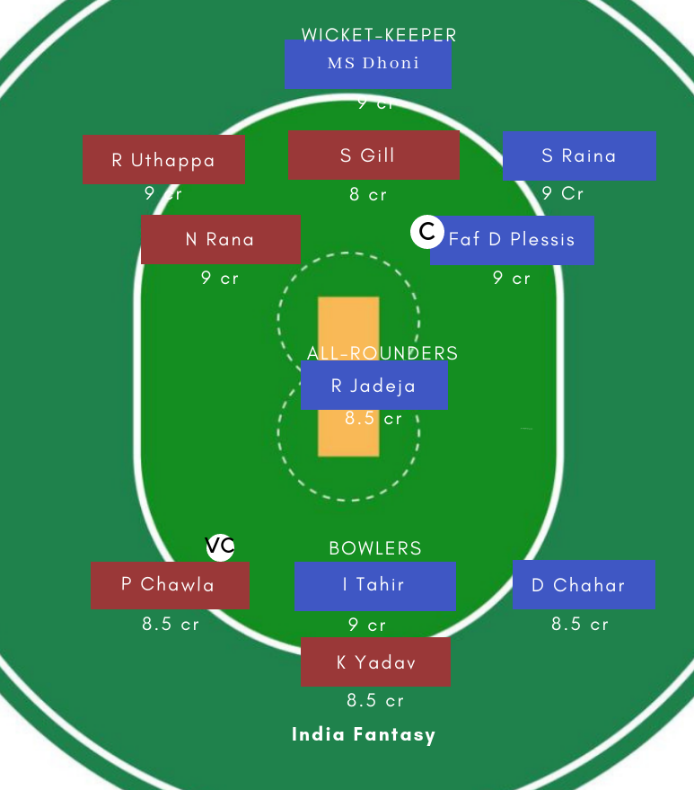 Chennai Super Kings (Playing XI): Shane Watson, Faf du Plessis, Suresh Raina, Ambati Rayudu, Kedar Jadhav, MS Dhoni(w/c), Ravindra Jadeja, Mitchell Santner, Deepak Chahar, Shardul Thakur, Imran Tahir