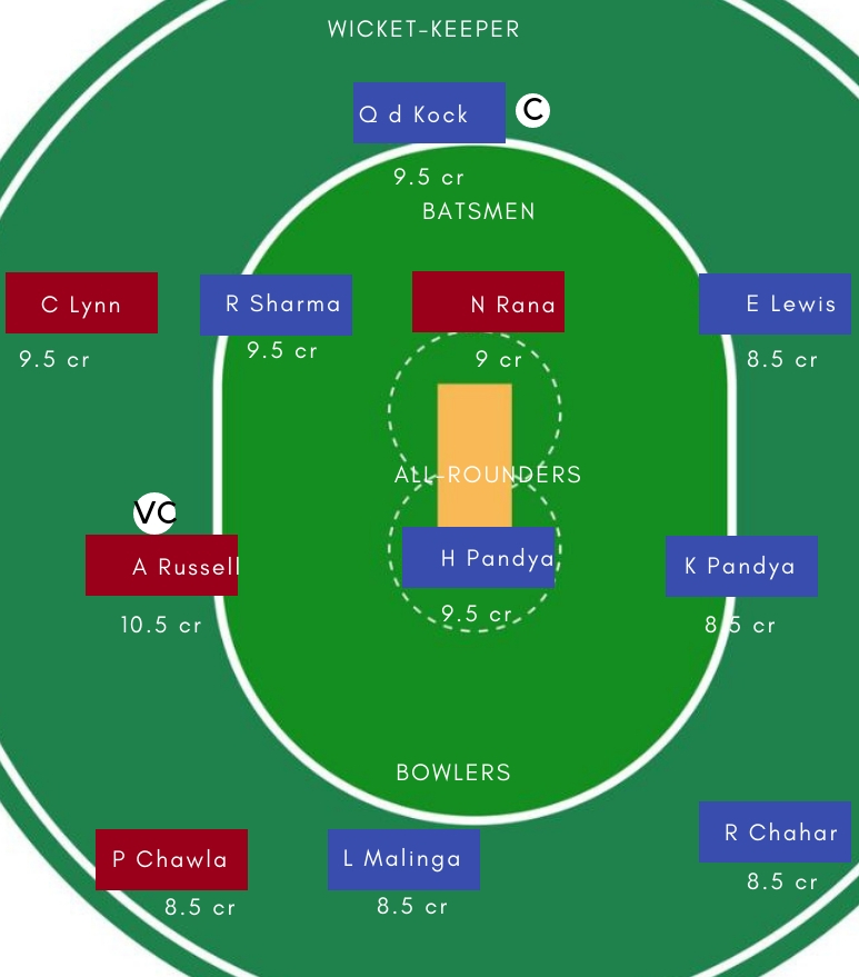 बल्लेबाज – बल्लेबाजी में Rohit Sharma, Chris Lynn, Nitish Rana, Suryakumar Yadav सबसे अच्छे विकल्प होंगे। Rohit Sharma ने आखिरी मैच में 67 रनों की शानदार पारी खेली थी। इस सीजन अबतक वो 11 मैचों में 295 रन बना चुके है। जबकि Nitish Rana ने 11 मैचों में कुल 318 रन बनाए है।