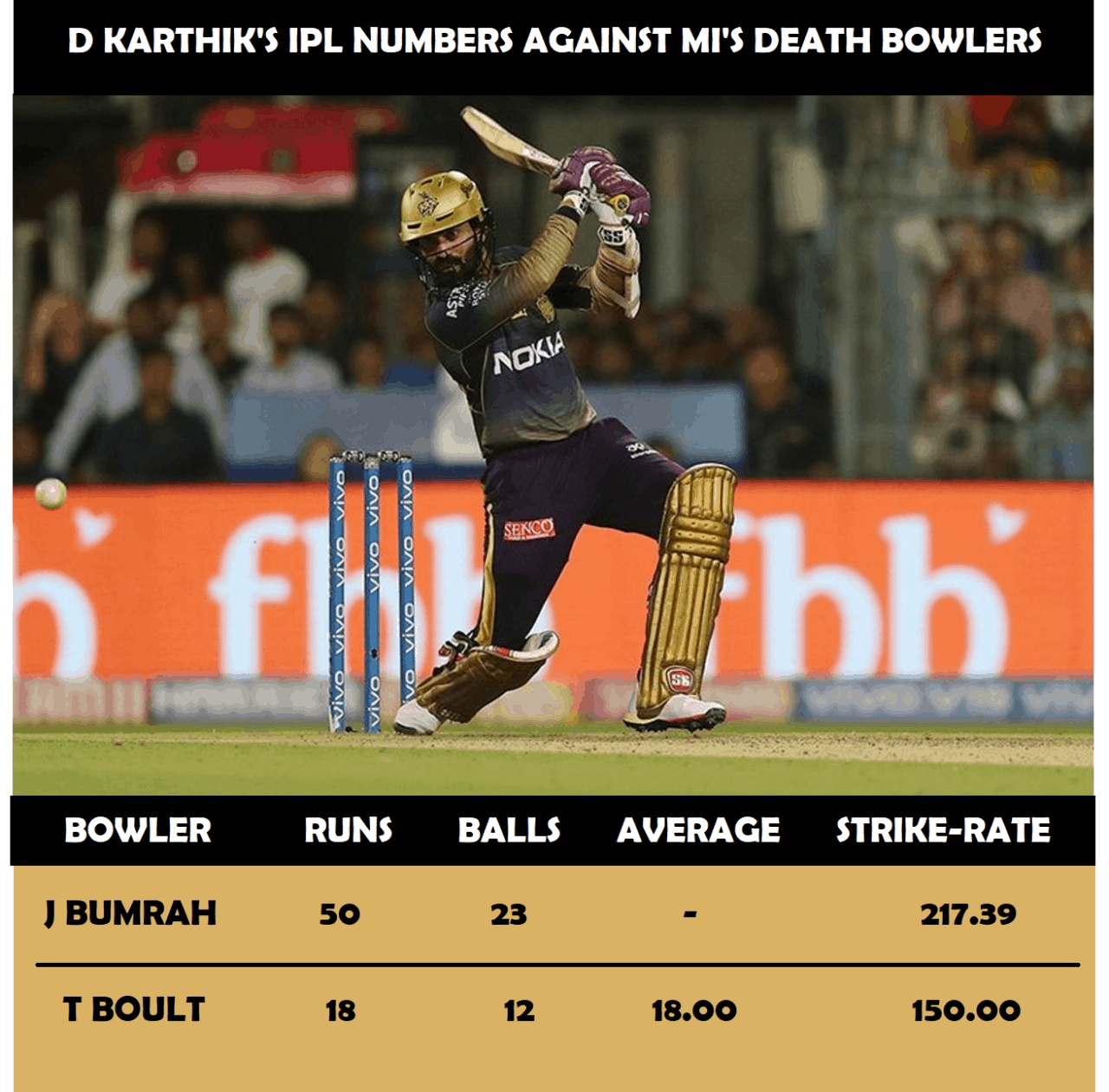 D Karthik had a stellar 2018 season for KKR often coming in at the 10th over and finishing off the matches but the promotion of Gill at the top reduced his game-time in 2019. He has a high probability of batting at the death today and his numbers against Bumrah and Boult, MI’s two death bowlers should excite you.
