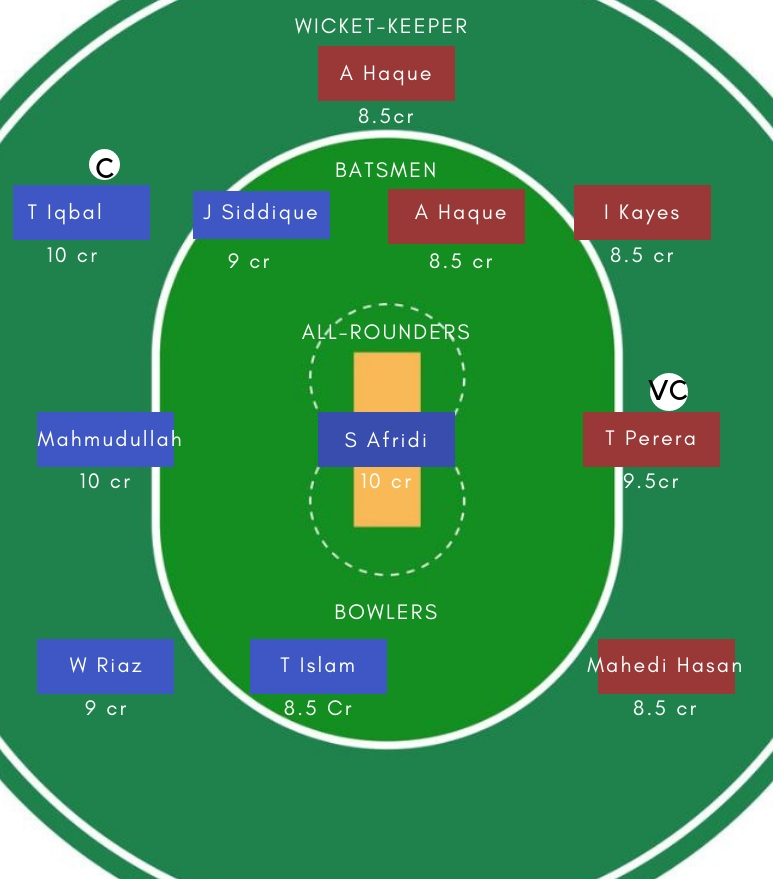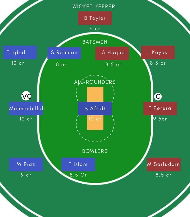 ऑलराउंडर – ऑलराउंडर के तौर पर Thisara Perera, Shahid Afridi, Mahmudullah सबसे अच्छे ऑप्शन होगें। Perera ने पिछले मैच में बल्ले और गेंद दोनों से अहम योगदान दिया था। वही, Afridi ने इस सीजन अपनी गेंदबाजी से काफी प्रभावित किया है।