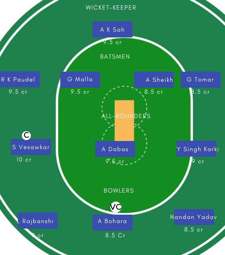 गेंदबाज – गेंदबाजी में Lalit Rajbanshi, Nandan Yadav, Rashaid Khan, Avinash Bohara, Sagar Dhakal सबसे अच्छे विकल्प होगें। Lalit ने पिछले मैच में चार विकेट अपने नाम किए थें। वही, Avinash Bohara का प्रदर्शन इस सीजन शानदार रहा है।