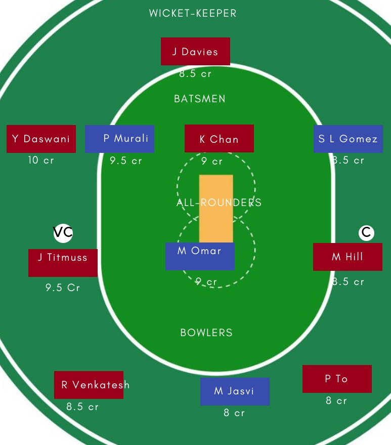 बल्लेबाज – बल्लेबाजी में Bella Poon, Y Daswani, Priyada Mural सबसे अच्छे विकल्प होगें। Y Daswani अकेले दम पर मैच का रुख पलटने का माद्दा रखती है।