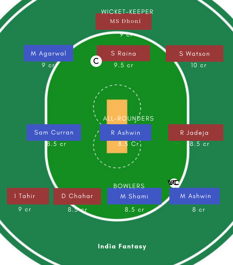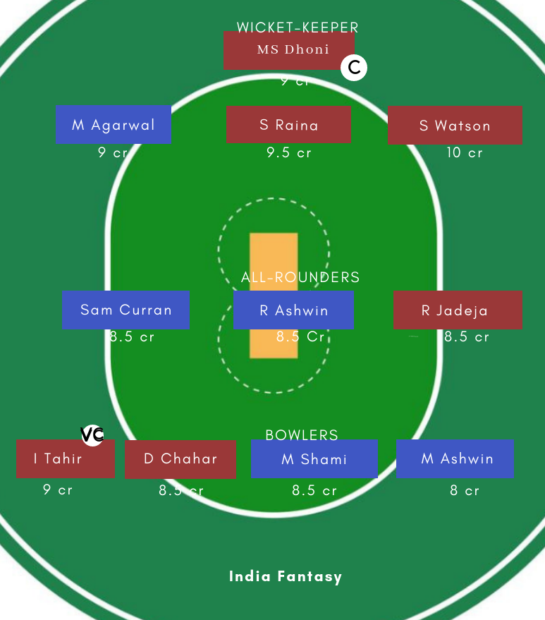 Deepak Chahar, MS Dhoni (C), Shane Watson, Ambati Rayudu, Ravindra Jadeja, Suresh Raina, Kedar Jadhav, S Kuggeleijn, Harbhajan Singh, Shardul Thakur, Imran Tahir
