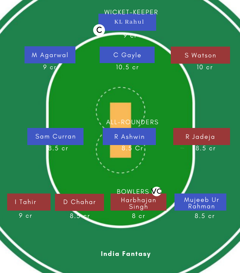 Mohammed Shami, Sam Curran, Lokesh Rahul, Mayank Agarwal, Sarfaraz Khan, David Miller, C Gayle, Ravichandran Ashwin (c), Murugan Ashwin, Mandeep Singh, Mujeeb Ur Rahman