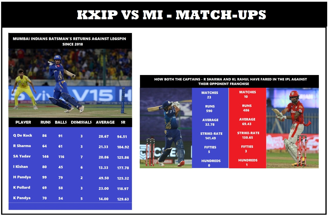 I Kishan – He made a great comeback to the side against RCB with a 58 ball 99. With KXIP fielding two leg-spinners in their eleven, MI would look to employ him at the top to counter those match-ups which will provide him enough game time.