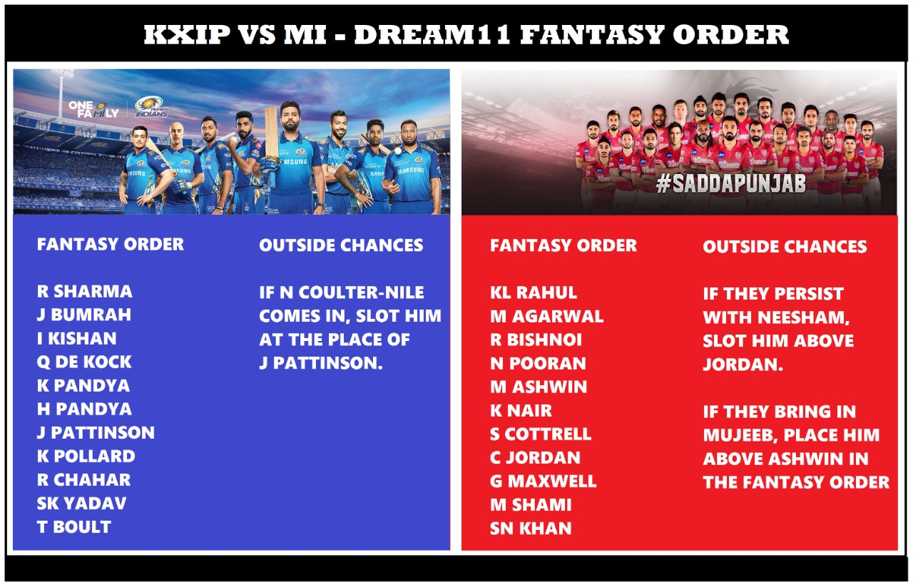 Having more MI players in the KXIP vs MI Dream11 Match Prediction team is preferable.