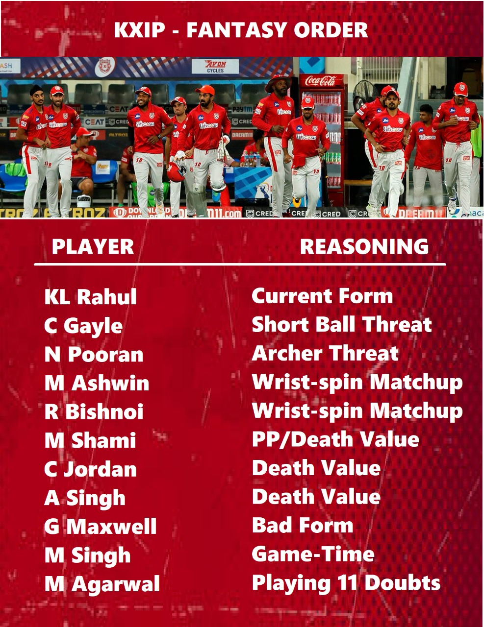 KXIP vs RR Dream 11 Playing 11 KXIP Playing 11 KL Rahul (C & WK) M Agarwal C Gayle N Pooran G Maxwell M Singh C Jordan M Ashwin M Shami R Bishnoi A Singh