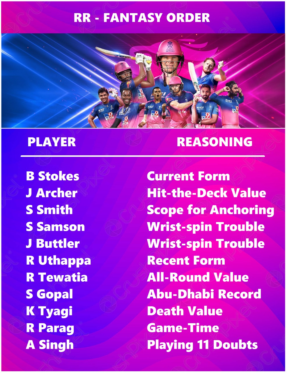 B Stokes – He took some time to get used to the new opening position for Rajasthan Royals but he proved the move right by scoring an unbeaten 107 against Mumbai Indians last game. His struggles in IPL are mostly against the wrist-spinners but he should cope well given the Powerplay cushion. B Stokes in last 5 T20 matches: Runs – 212, Average – 53 B Stokes against wrist-spinners in all T20s: Runs –148, Average – 13.5
