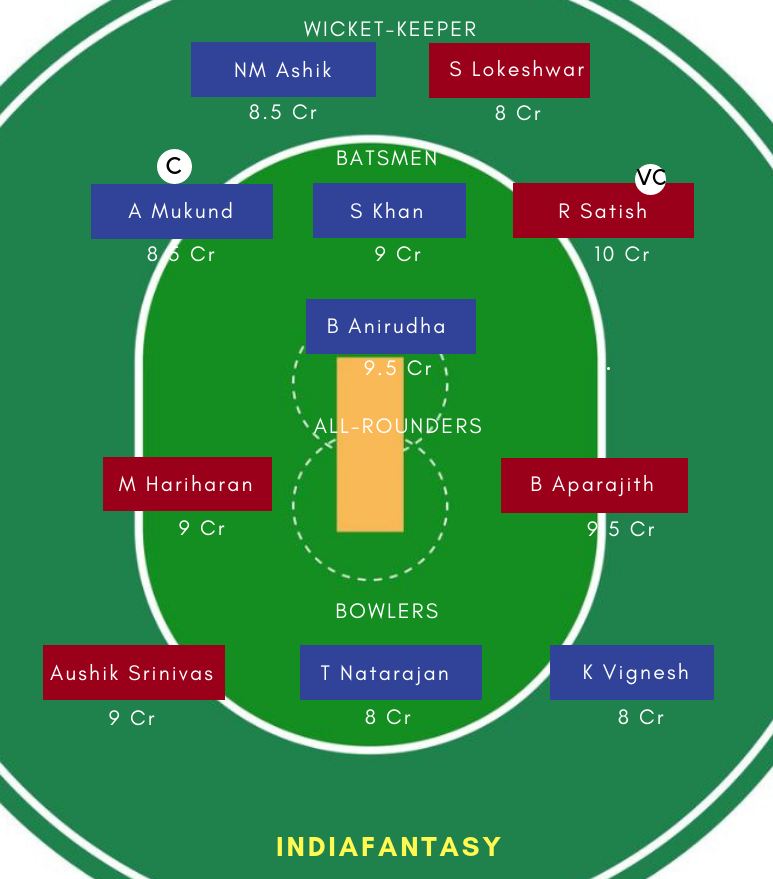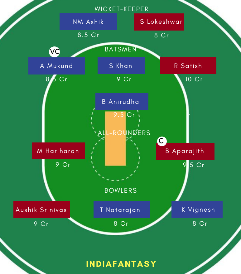 Abhinav Mukund (C), B Anirudh Sita Ram, Malolan Rangarajan, T Natarajan, Shahrukh Khan, S Ajith Ram, Muhammed Khan (WK), Krishnamoorthy Vignesh, Antony Dhas, J Suresh Kumar, M Raja