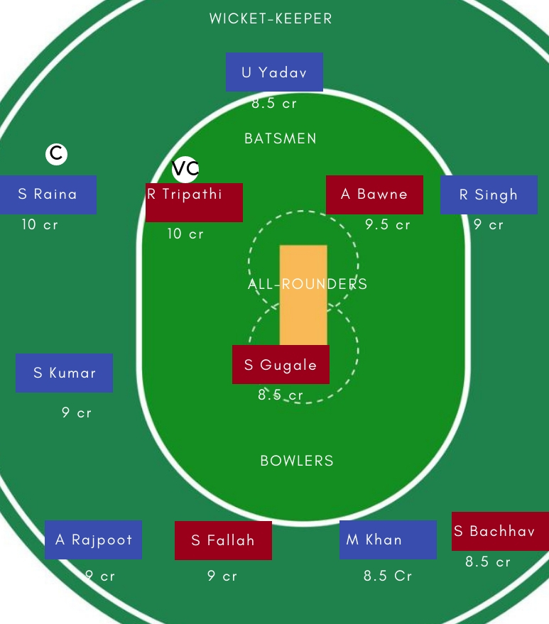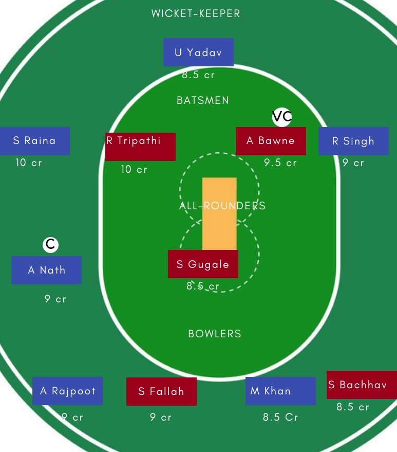 गेंदबाज – गेदबाजी में Ankit Rajpoot, Mohsin Khan, Samad Fallah, Satyajeet Bachhav सबसे बेहतर विकल्प होगें। Ankit Rajpoot इस समय बेहद शानदार फॉर्म में मौजूद है।