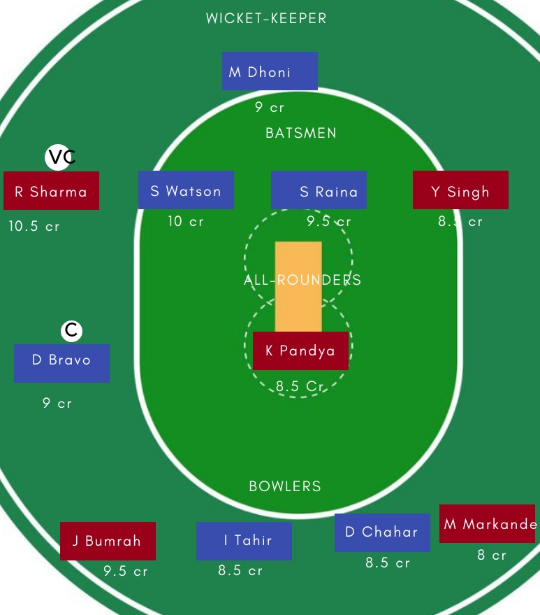 बल्लेबाज – बल्लेबाजी में Rohit Sharma, Shane Watson, Suresh Raina, Yuvraj Singh सबसे अच्छे विकल्प होगें। Rohit Sharma ने पंजाब के खिलाफ अच्छी पारी खेली थी। जबकि Suresh Raina भी पिछले मैच में रंग में नजर आए थें।