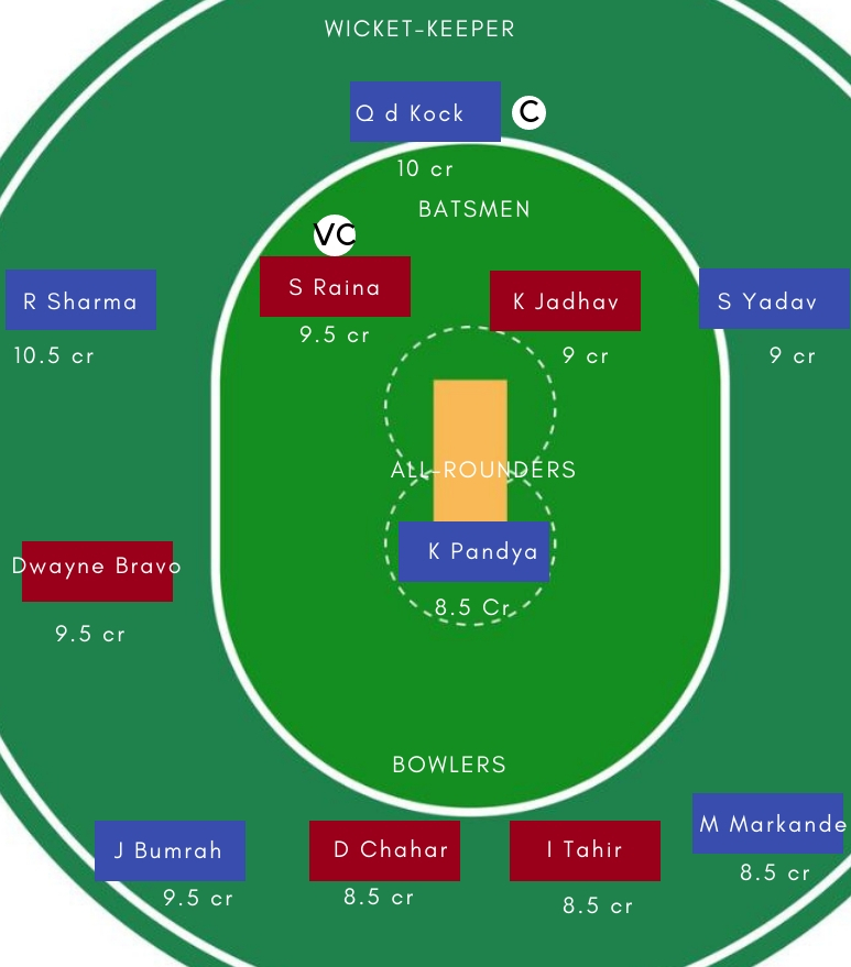 गेंदबाज – गेंदबाजी में Deepak Chahar, Imran Tahir, Jasprit Bumrah,सबसे अच्छे विकल्प होगें। Deepak Chahar ने पिछले मैच में महज 19 रन देकर दो अहम विकेट अपने नाम किए थें। वही, Imran Tahir ने इस सीजन शानदार गेदबाजी की है।