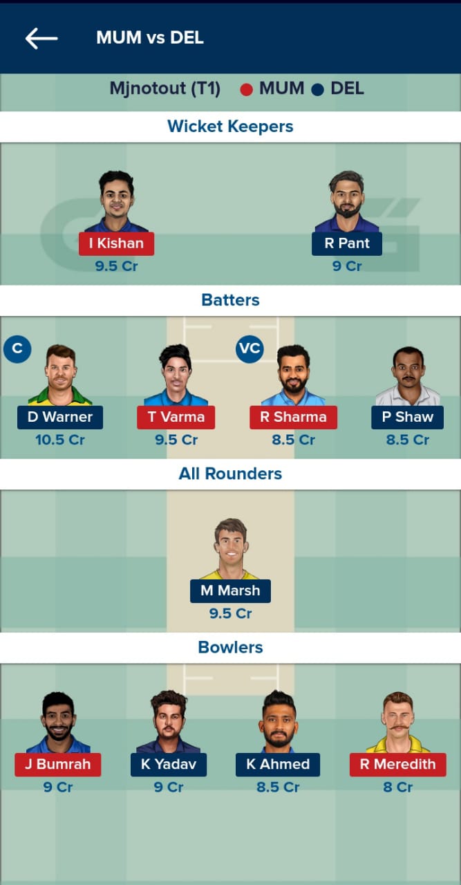 WICKET-KEEPERS: Ishan Kishan, Rishabh Pant BATSMEN: David Warner, Tilak Varma, Rohit Sharma, Prithvi Shaw ALL-ROUNDERS: Mitchell Marsh BOWLERS: Jasprit Bumrah, Kuldeep Yadav, Riley Meredith, Khaleel Ahmad