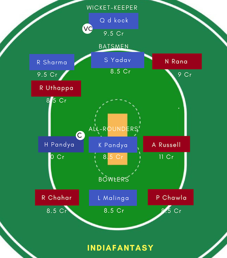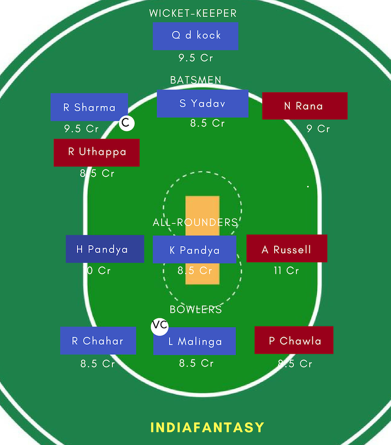 C Lynn, R Sharma, and Shubhman Gill are the favourites in batsmen. So, Nitish Rana, Surya Kumar Yadav and Ewin Lewis/K Pollard can be the best picks