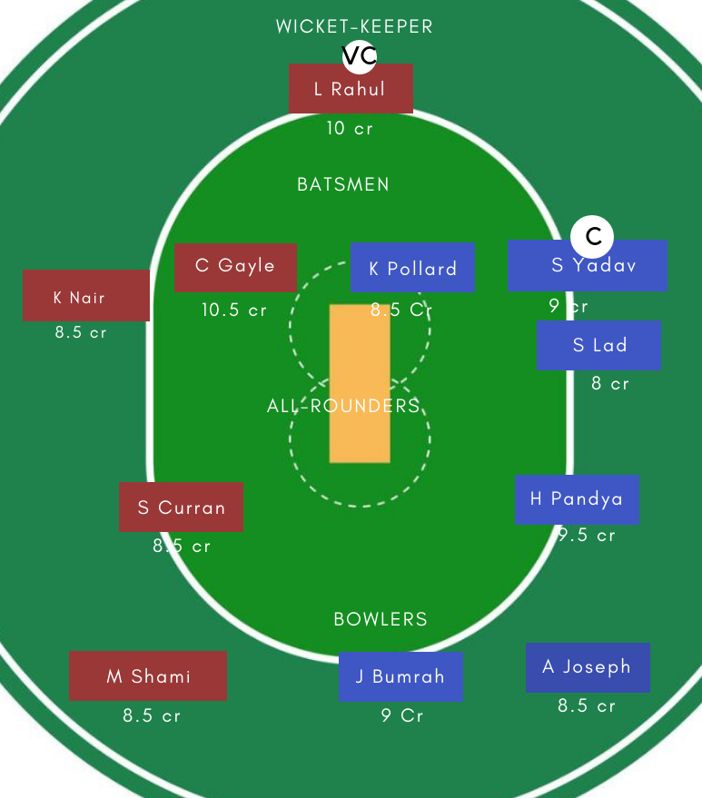 बल्लेबाज – बल्लेबाजी में Suryakumar Yadav, Chris Gayle, Mayank Aggarwal, Sarfarz Khan सबसे अच्छे विकल्प होगें। Mayank ने पिछले मैच में शानदार अर्धशतकीय पारी खेली थी। जबकि Suryakumar Yadav इस सीजन अच्छी लय मे नजर आए है।