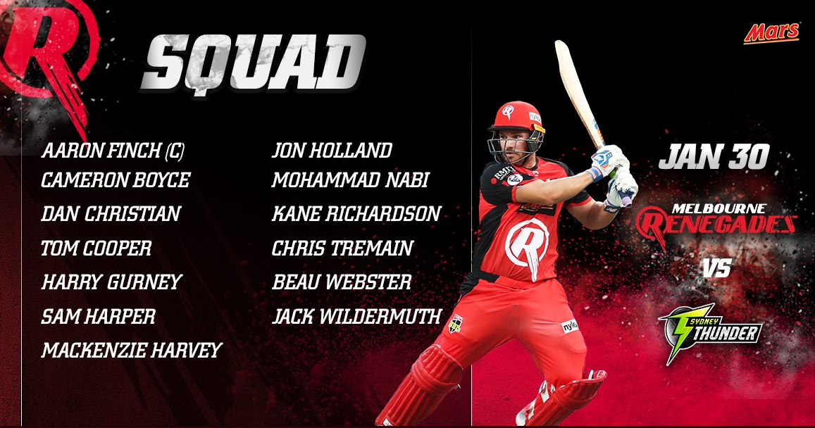 Melbourne Renegades- Aaron Finch (C), Cameron Boyce, Dan Christian, Tom Cooper, Harry Gurney, Sam Harper, Mackenzie Harvey, Jon Holland, Mohammad Nabi, Kane Richardson, Chris Tremain, Beau Webster, Jack Wildermuth