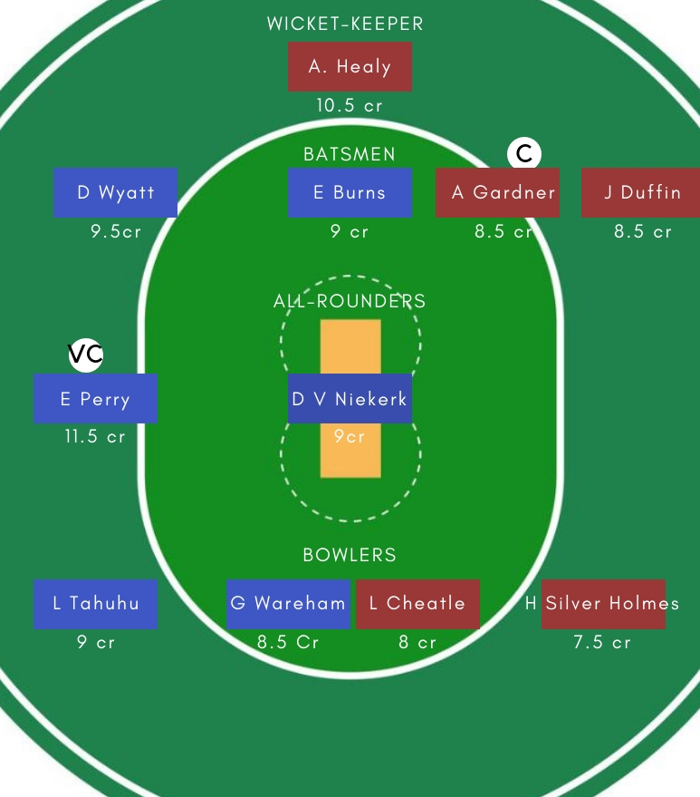 ऑलराउंडर – ऑलराउंडर के तौर पर Ellyse Perry, Sophie Molineux, Ashliegh Gardner सबसे अच्छी विकल्प होगी। Elysse Perry ने इस सीजन बेहद शानदार बल्लेबाजी का प्रदर्शन किया है। वही, Sophie Molineux ने भी बल्ले और गेंद दोनों से अहम योगदान दिया है।