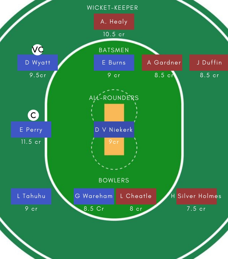 बल्लेबाज – बल्लेबाजी में Erin Burns, Sara McGlashen, Amy Satterhwaite, Danielle Wyatt सबसे अच्छी ऑप्शन होगी। Erin Burns ने इस सीजन अच्छी बल्लेबाजी का प्रदर्शन किया है। वही, Danielle Wyatt बड़े मैचों में अच्छी पारियां खेलने के लिए जानी जाती है।