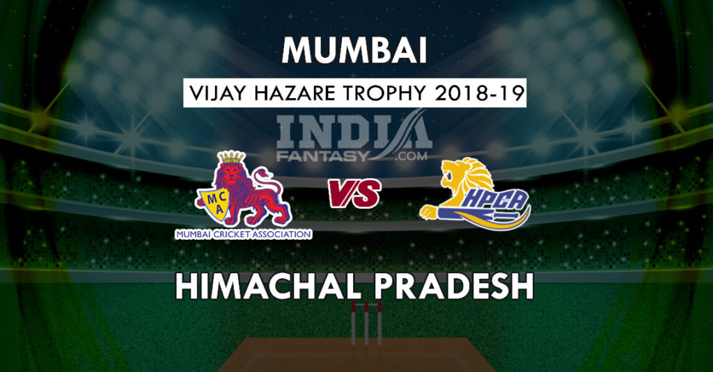 विजय हज़ारे ट्रॉफी के ग्रुप A के आठवें राउंड के अगले मुकाबले में Himachal Pradesh और Mumbai की टीम एक दूसरे के खिलाफ मुकाबले के लिए उतरेगी। इन दोनो के बीच यह मैच KSCA Cricket Ground Alur में खेला जाएगा। दोनो टीम इस समय बेहतरीन फॉर्म में है और दोनो की ही स्तिथि पॉइंट टेबल में बेहतर है।