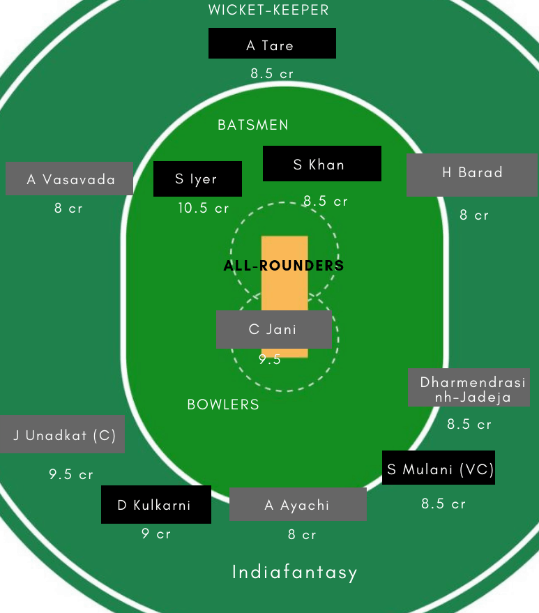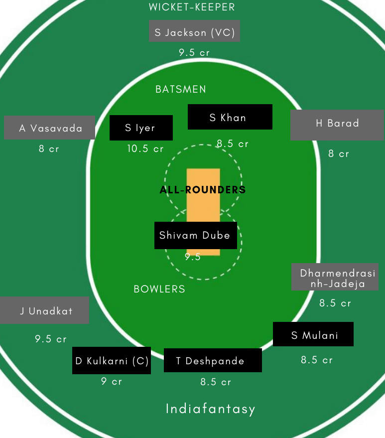 Mumbai – A Tare, S Iyer, S Yadav, S Khan, Shivam Dube, A Ankolekar, S Thakur, D Kulkarni, S Mulani, T Deshpane