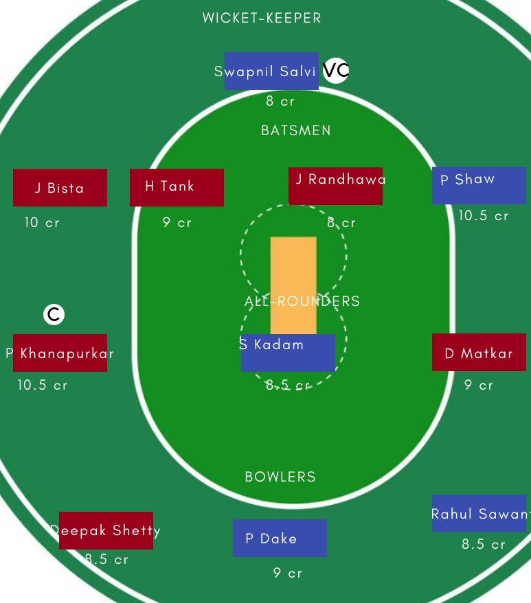 Vikrant Auti, Karan Nande, Swapnil Salvi , Atif Attarwala, Pravin Tambe, Prithvi Shaw (c), Prathamesh Dake, Sairaj Patil, Sumeet Dhekale, Rahul Sawant, Shashikant Kadam,